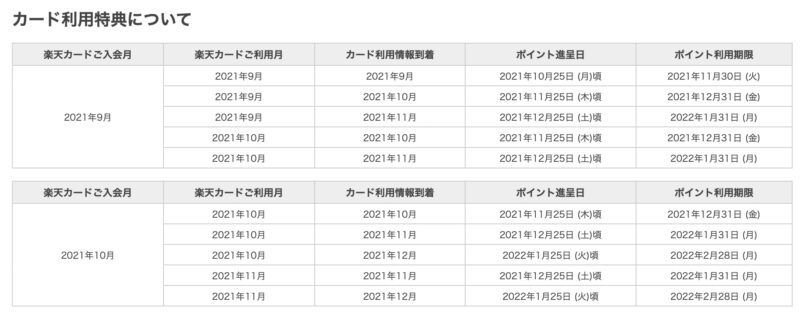 ポイント付与のタイミングは、楽天カードの利用時期によって変わりますので、